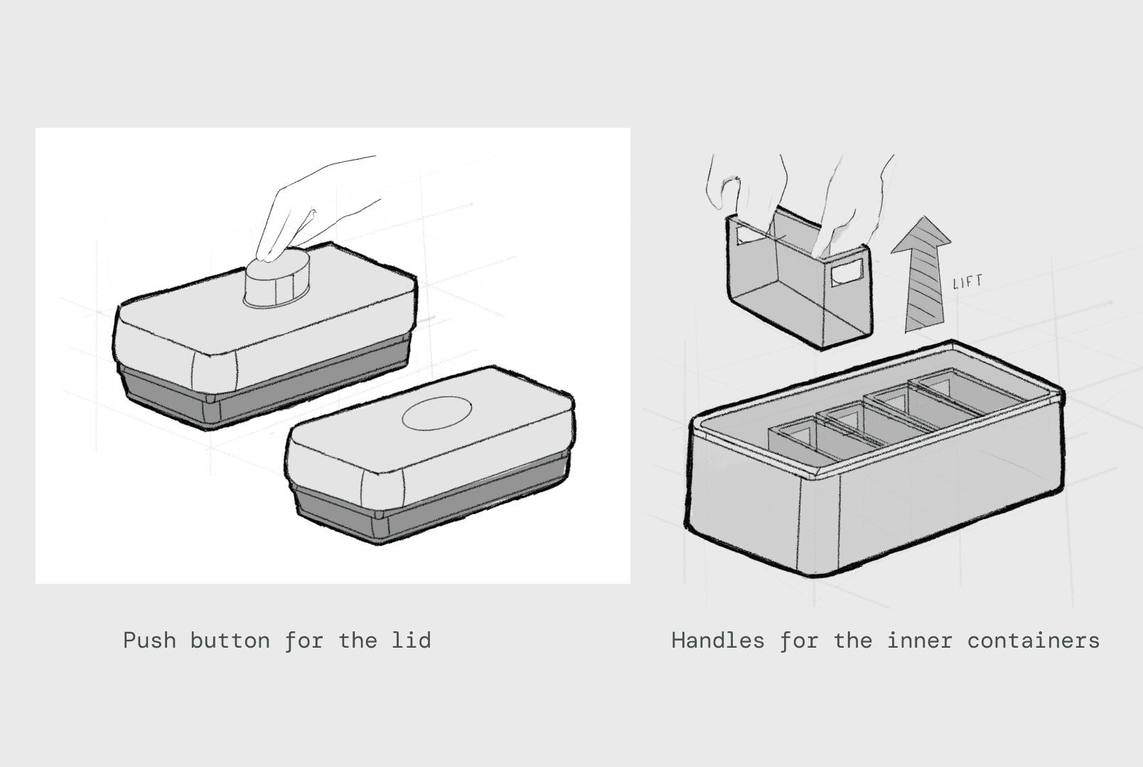 Recognizing the challenges some seniors face with motor function, the meal kit packaging is designed for effortless opening and closing. A push button with side grips simplifies the interaction—pressing the button unseals the lid, which pops out to indicate it’s ready to pull. The same button locks the lid back in place. Smaller containers within the kit include grips to make them easier to lift and handle.