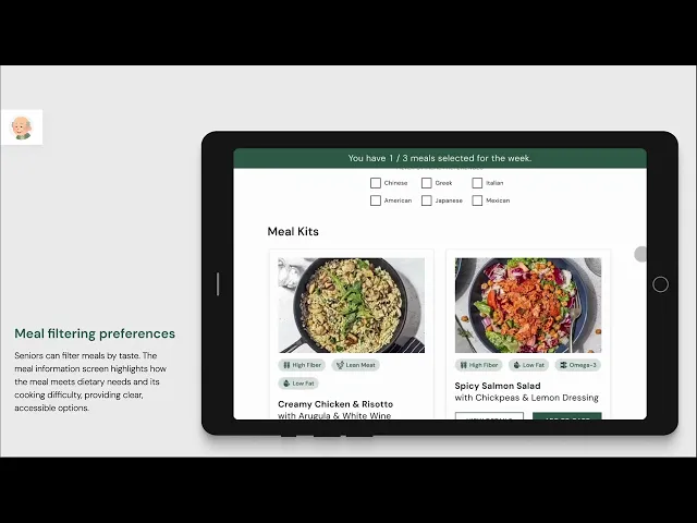 Seniors value their independence and want to choose meals that suit their preferences. They can filter options by taste and view detailed meal information. Compared to the caregiver screen, the seniors meal information screen is simplified to give them a basic understanding of how this meal matches their dietary needs and the difficulty level of the cooking process.